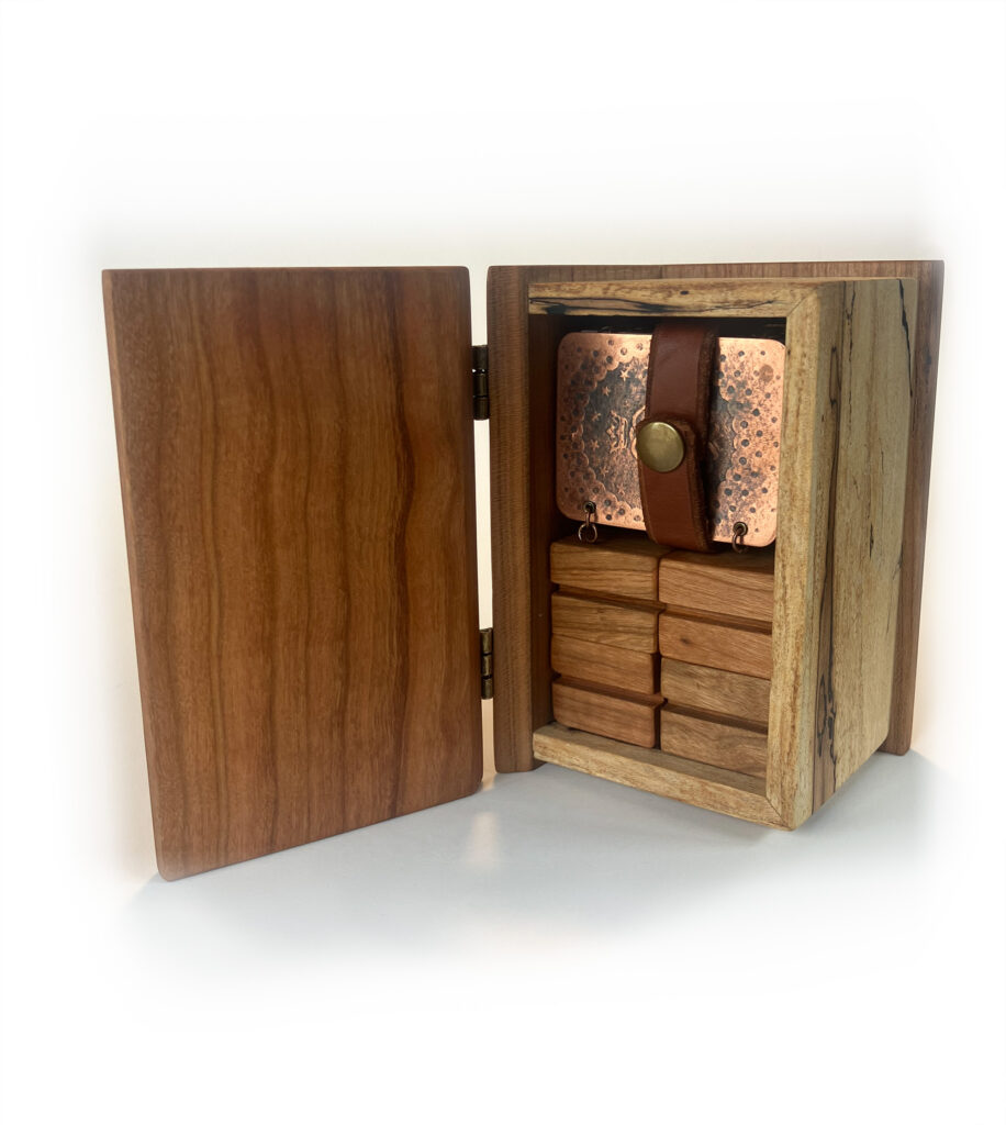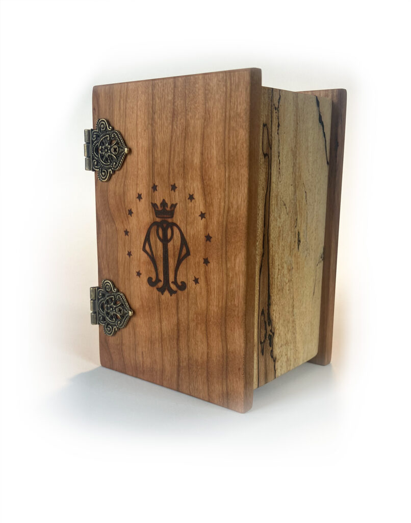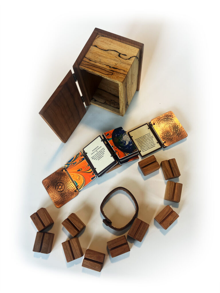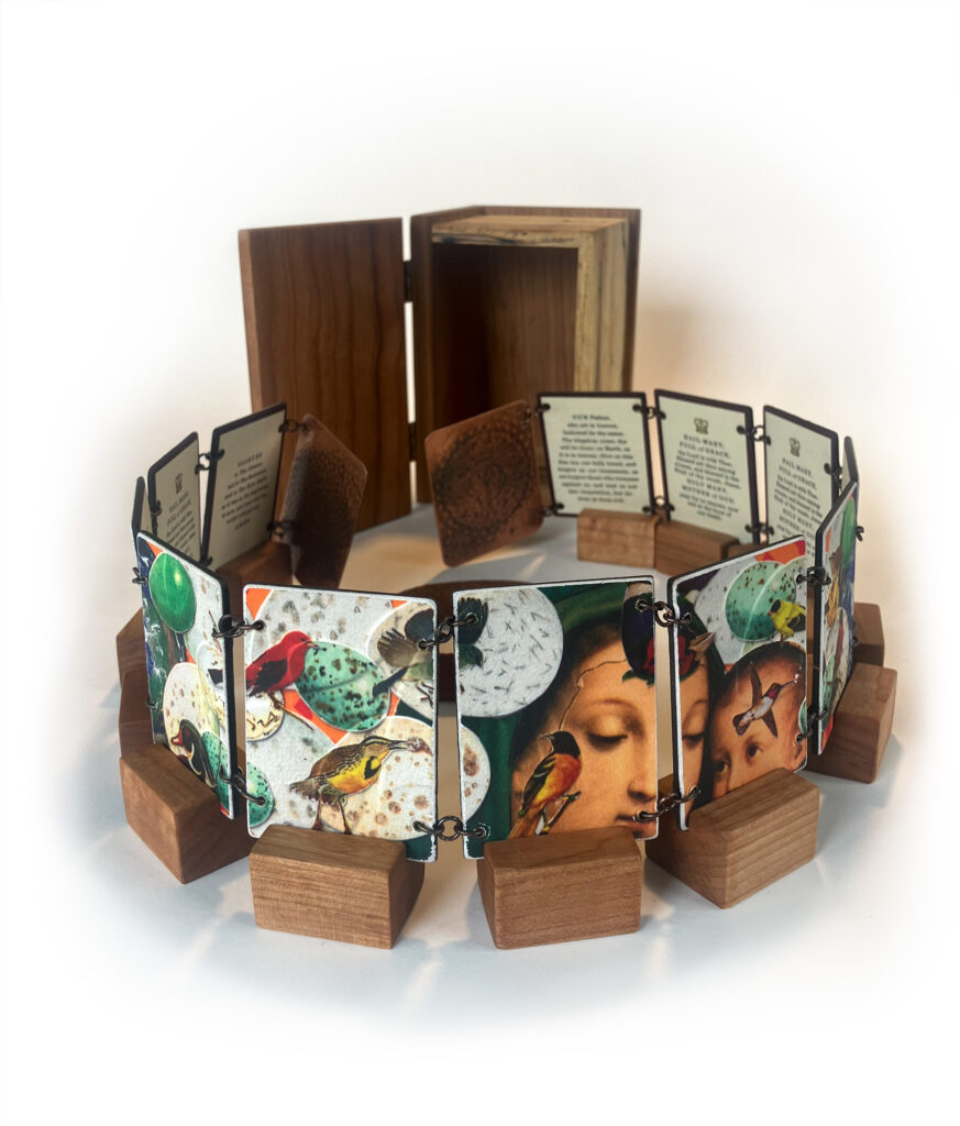2” x 2.5” x 2”, twelve rag mat board panels, featuring twelve pages of the prayers of the rosary and three pages of supporting text, hand set in 6 pt. Century Schoolbook and printed on Zerkall Frankfurt Cream, mounted on burgundy end sheet paper (leftover from the For Dust I Am books); and one giclee print of an original analogue/digital collage featuring song bird egg drawings by JoAnna Poehlmann divided between 9 panels; linked though 48 grommets with copper jump rings; and covered with copper plates embossed by Gwen Youngblood and patinated by Nan Marshall; held tidy with a leather strap by Ashley Neary. The book is housed in a hinged wooden box of cherry and spalted maple, branded with the same design embossed on the copper covers, and includes 12 wooden blocks for displaying the book. Limited edition of 11 numbered copies.